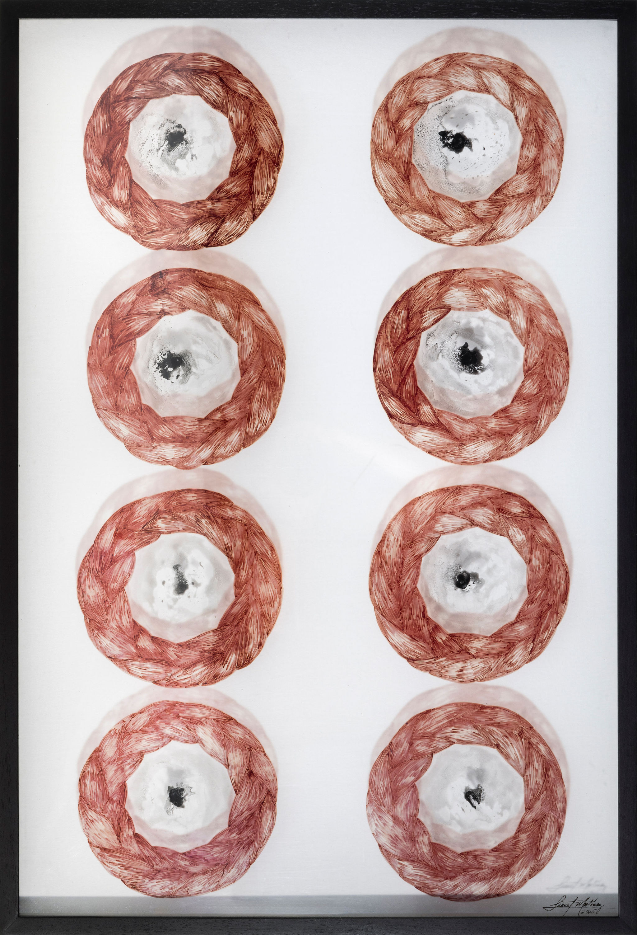 The Coraza series, which uses the shape of the Cuban shield as a hanger mold, embraces concepts, suggests defense, and at the same time becomes a space filled with evocative images of emotions and feelings. In a world that relativizes reality and defines itself as one of post-truth, Lianet’s work situates us within the territory of sensibility—the ultimate refuge of art, the space of the real: perhaps that which cannot be replaced as human experience in times when emotions are instrumentalized.